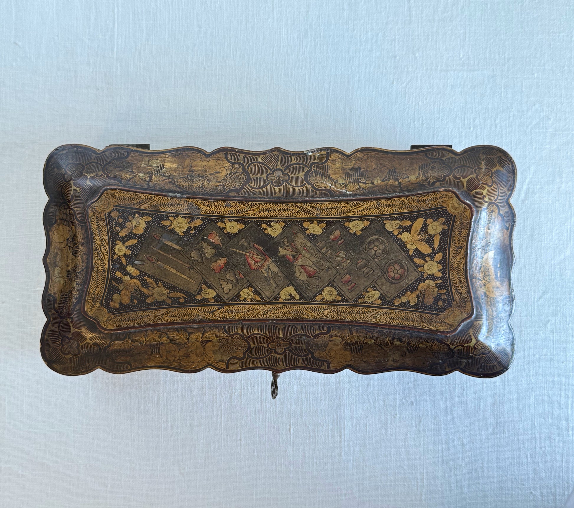 Antique Asian Lacquered Papier-Mâché Game Box with Gilded Detailing