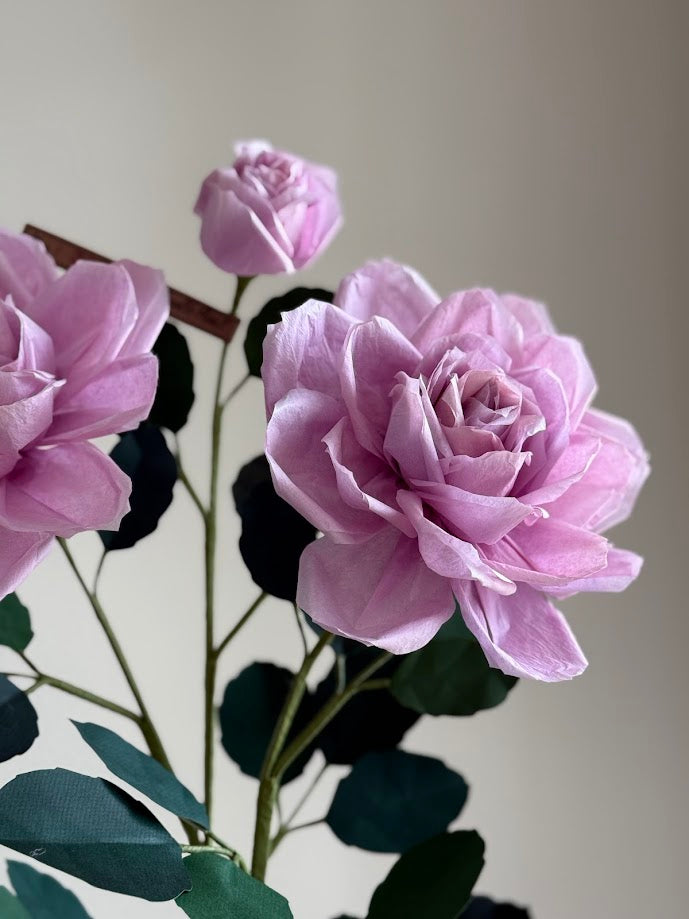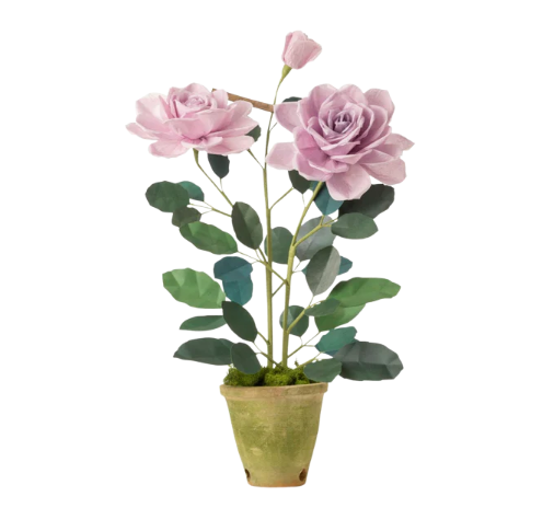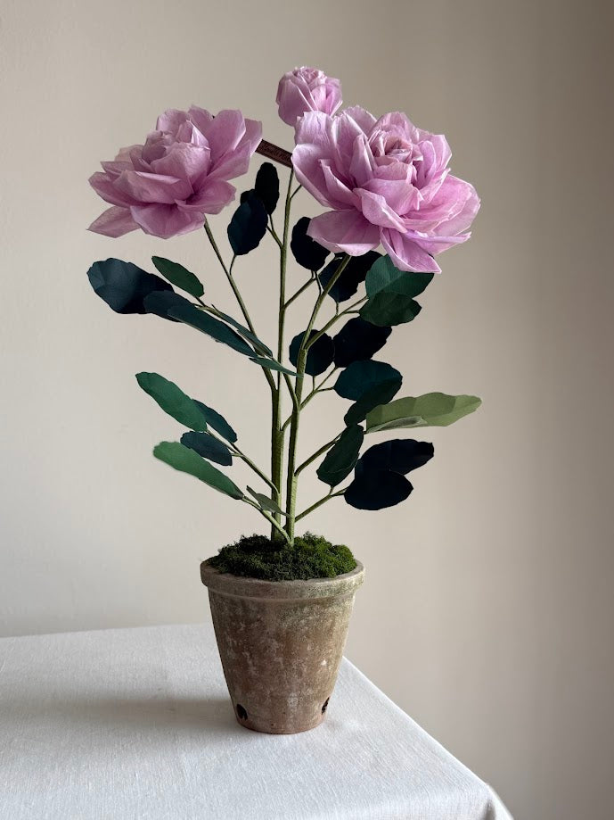 Hand crafted paper Charles de Gaulle rose plant with two blossoms and a bud in a beautiful aged terra cotta pot