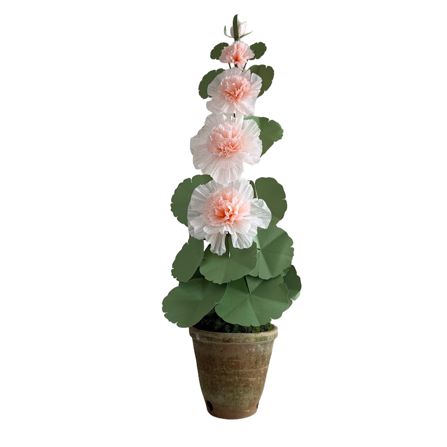 Hand crafted paper hollyhock plant with peach flowers an hand painted leaves in a beautiful aged terra cotta pot.