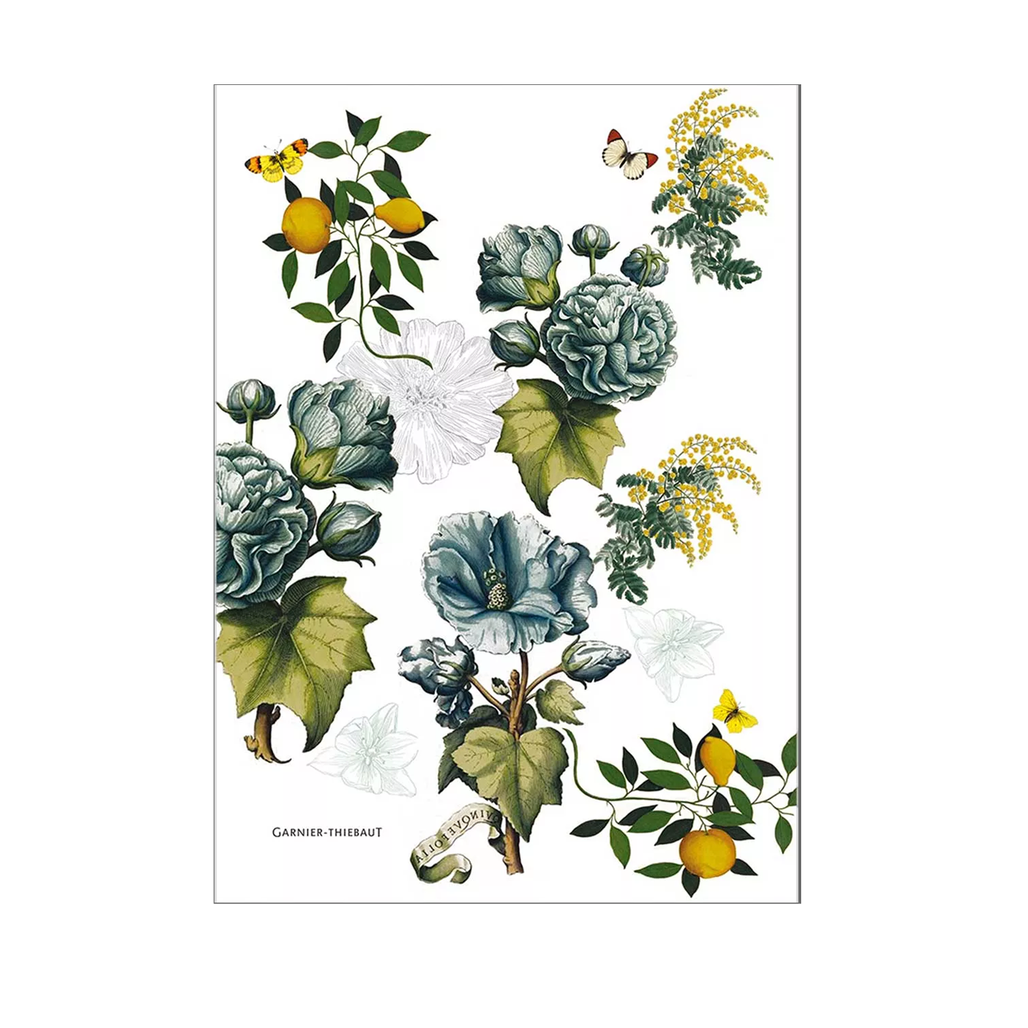 Linen-cotton blend tea towels with a classic blue floral and citrus print.