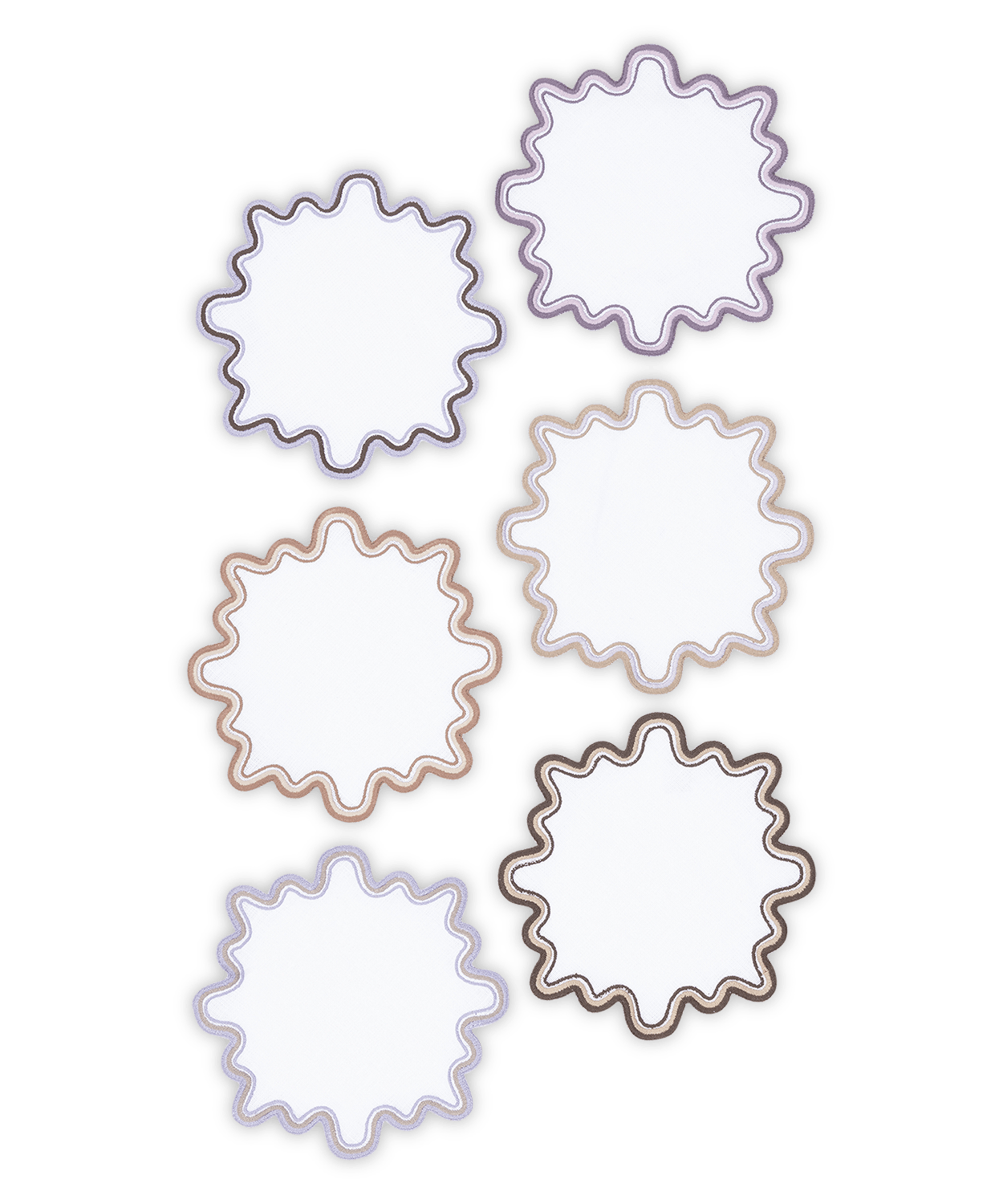 Set of six 100% linen cocktail napkins, featuring a playful wave shape that is emphasized by a meticulously embroidered border with a unique two-color combination for each of the six napkins