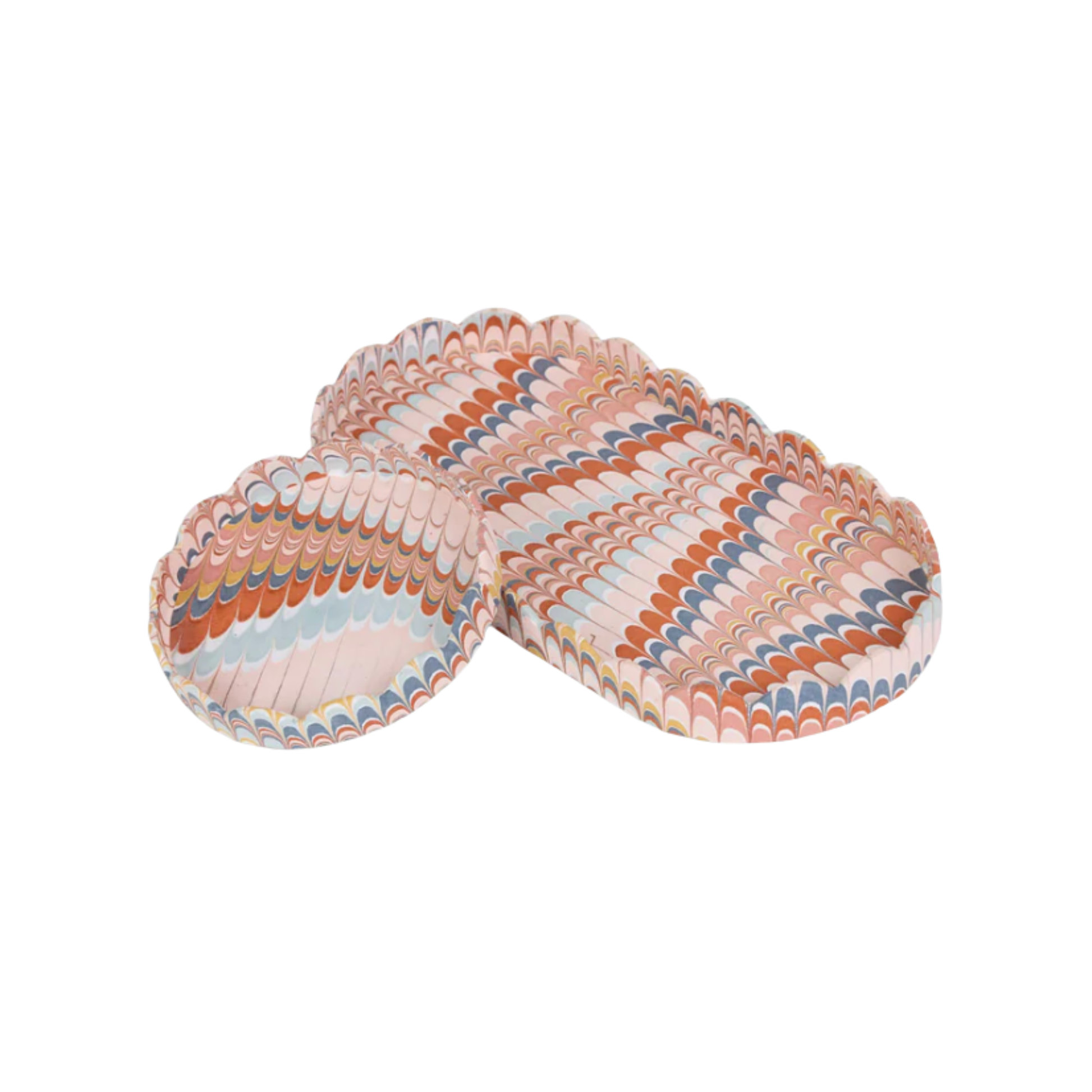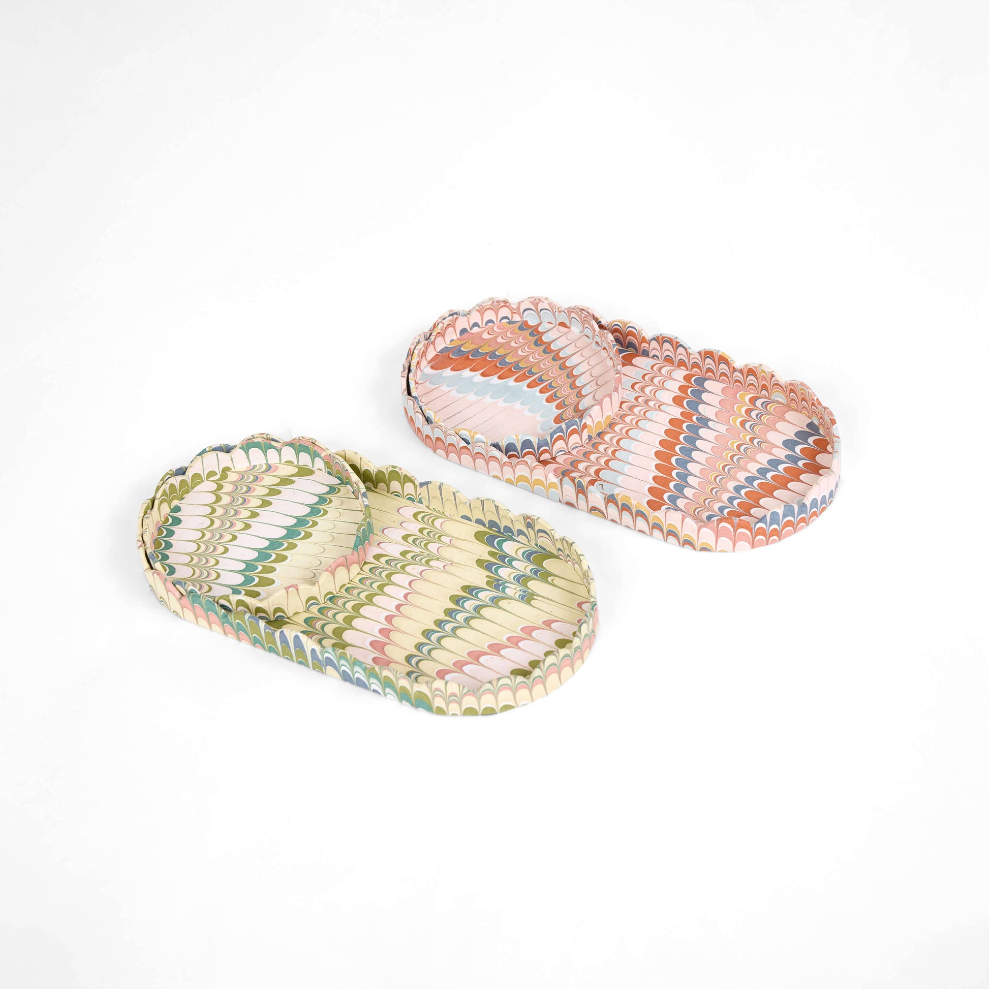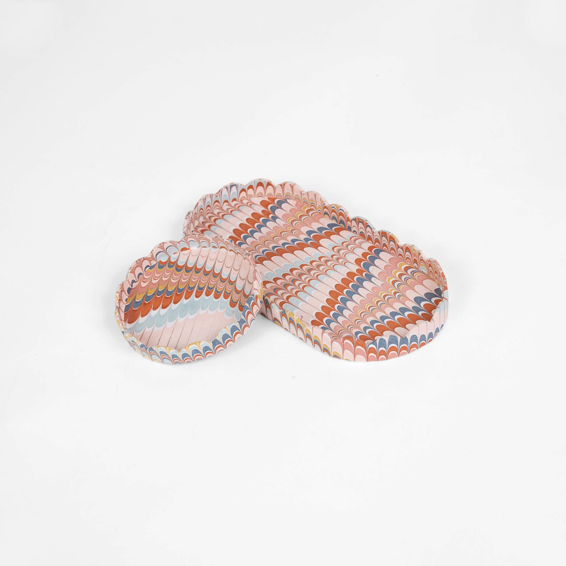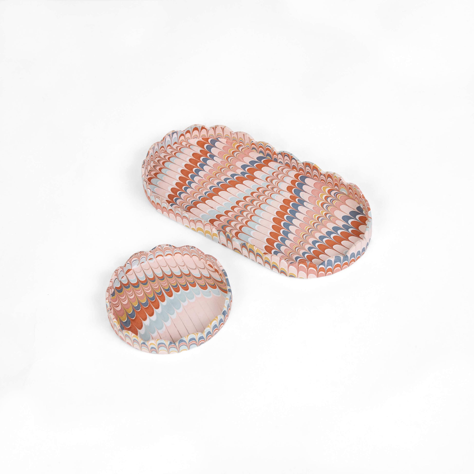 Recycled cotton paper tray that showcases exquisite hand-marbled designs. Ideal for organizing pencils, notes, and other small essentials, this tray set is perfect for desks, entryways, or bedside tables.