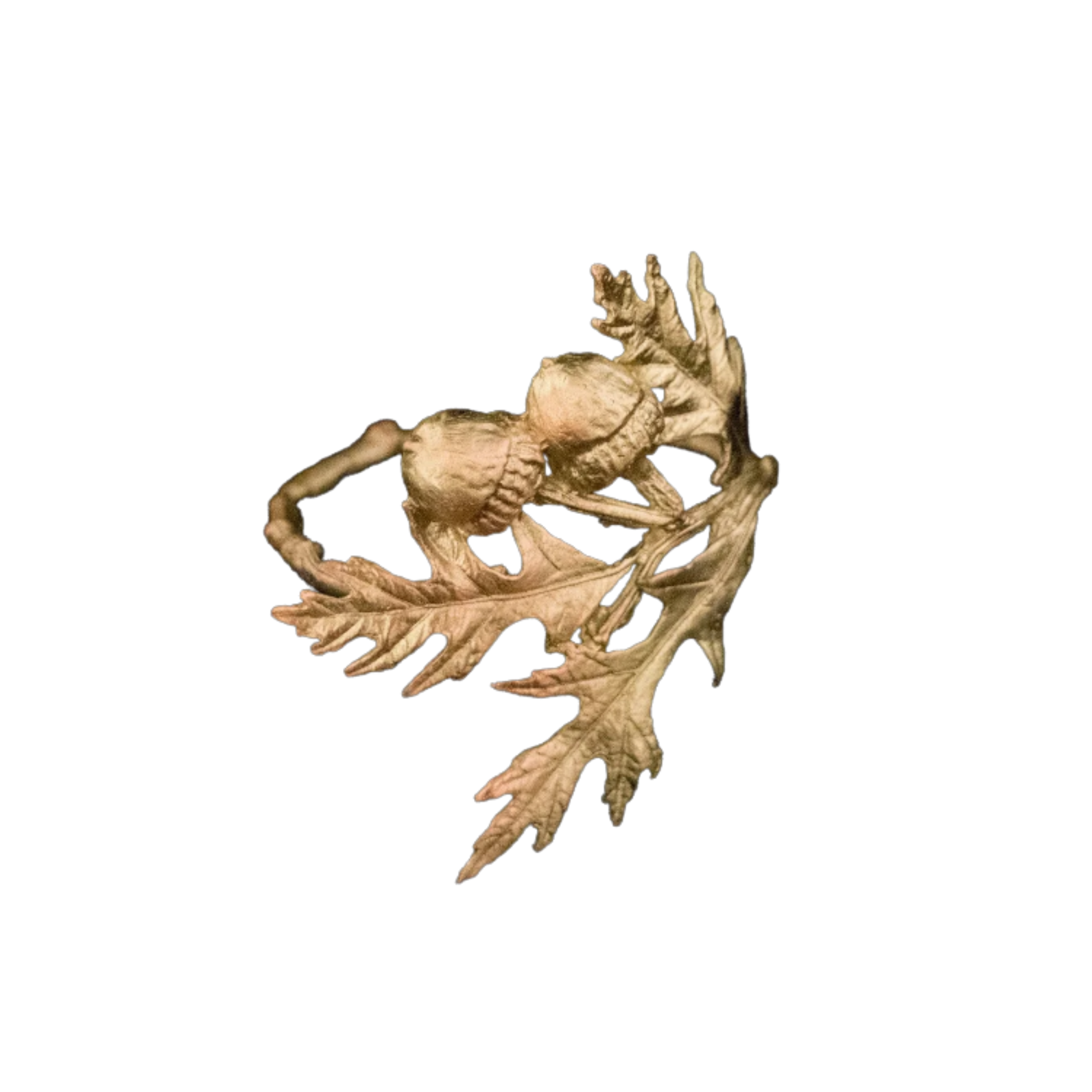 Set of 8 acorn and oak napkin rings, cast in pewter with hand relieved gold finish.
