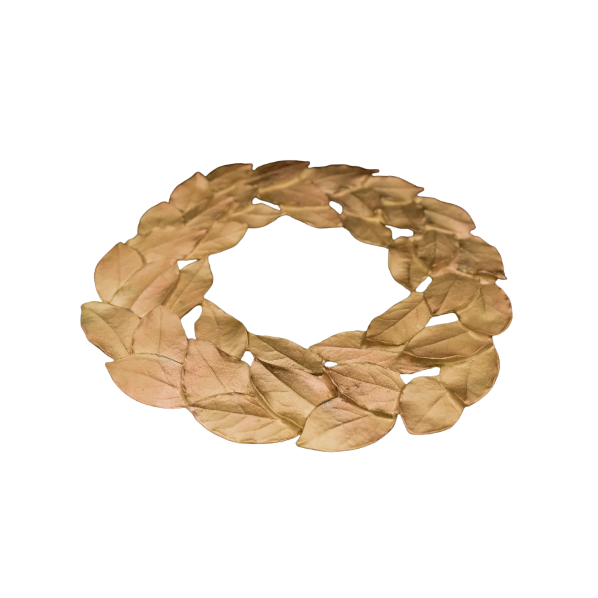 Bay leaf wreath trivet cast in pewter with hand relived gold finish