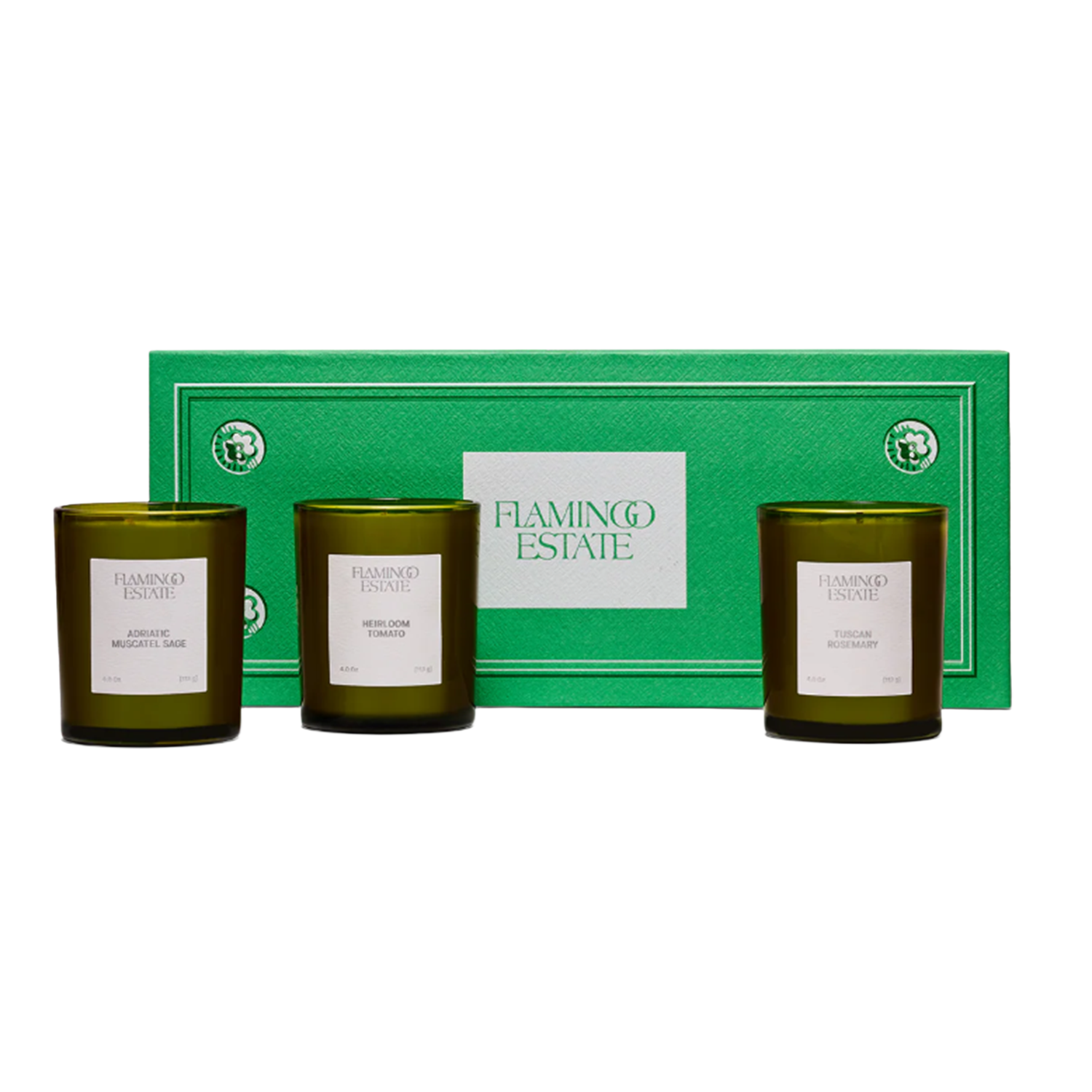 These three Candles are our Flamingo Estate's most beloved scents. They are the origin story, and an embodiment of the garden — where a sea of Rosemary, Sage, and Tomato plants tingle your nose and push you along the pathways. They are hand-poured in petite glass vessels so you can light them all at once and create ambiance, gift them, or trial their most iconic scents.