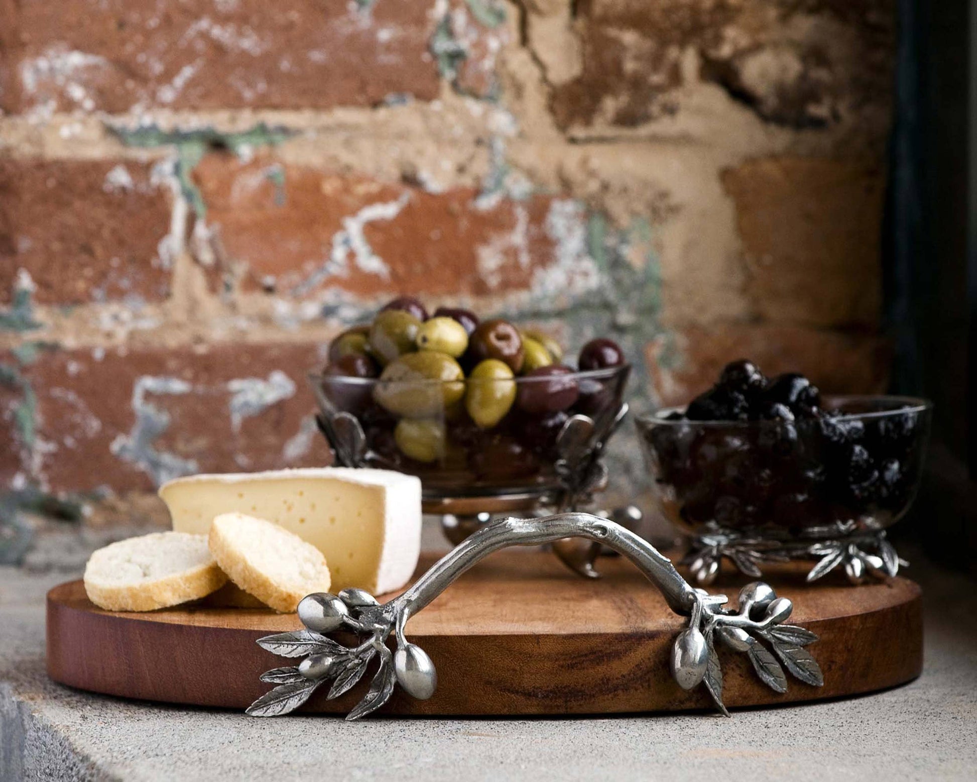 This large round, pewter embellished cheese board is created from lustrous, water resistant oak wood. A simple, delicately detailed design of olives and leaves, inspired by ancient Greek Olympian crowns embellishes the pewter handles.