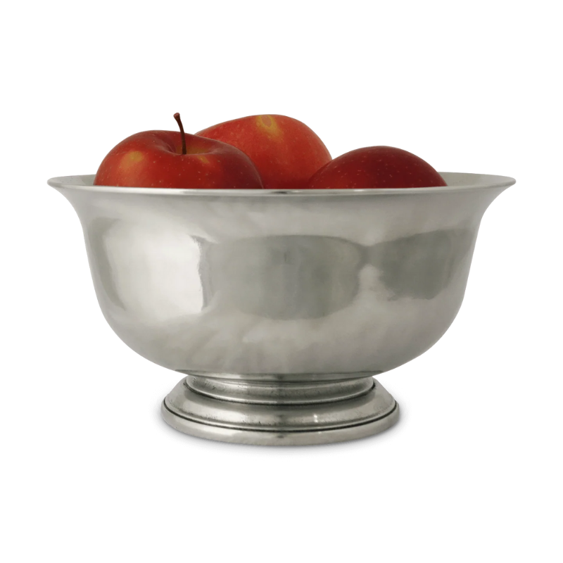 A classic footed Revere Bowl rendered in Italian pewter. Its graceful curves make it perfect as a floral centerpiece or fruit bowl.